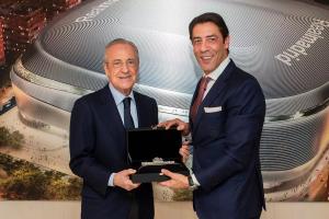 皇马vs本菲卡赛前,两队主席弗洛伦蒂诺和鲁伊·科斯塔互赠礼物